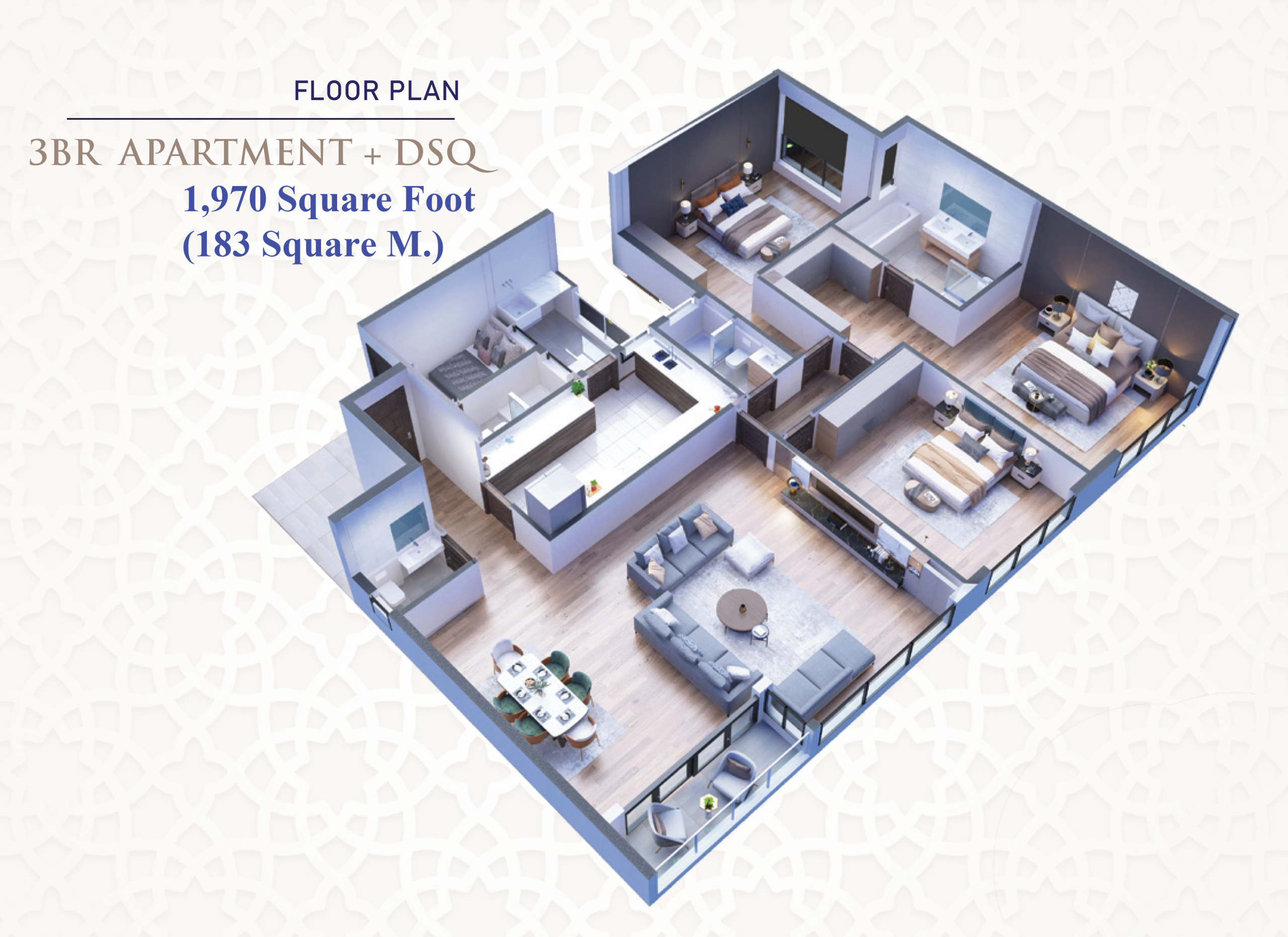 The 3-bedroom apartment at Gazebo Apartments, featuring 183 SQM of spacious living, offers a perfect blend of comfort and elegance. Each unit includes a generously sized master bedroom with an ensuite bathroom, two additional bedrooms, and a Domestic Staff Quarters (DSQ) for added convenience.